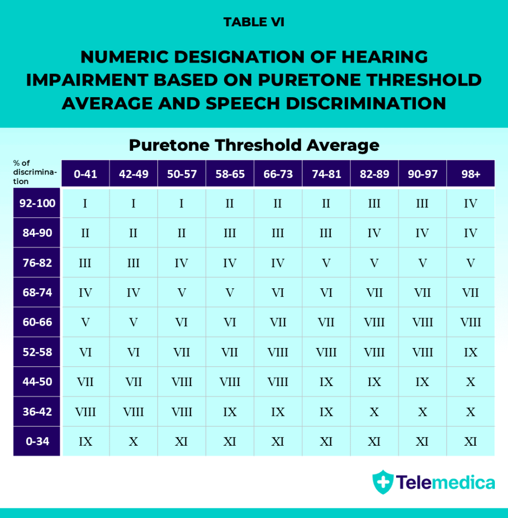 Once each ear has a Roman numeral, the VA uses Table VII to calculate your final VA hearing loss rating (0%–100%).